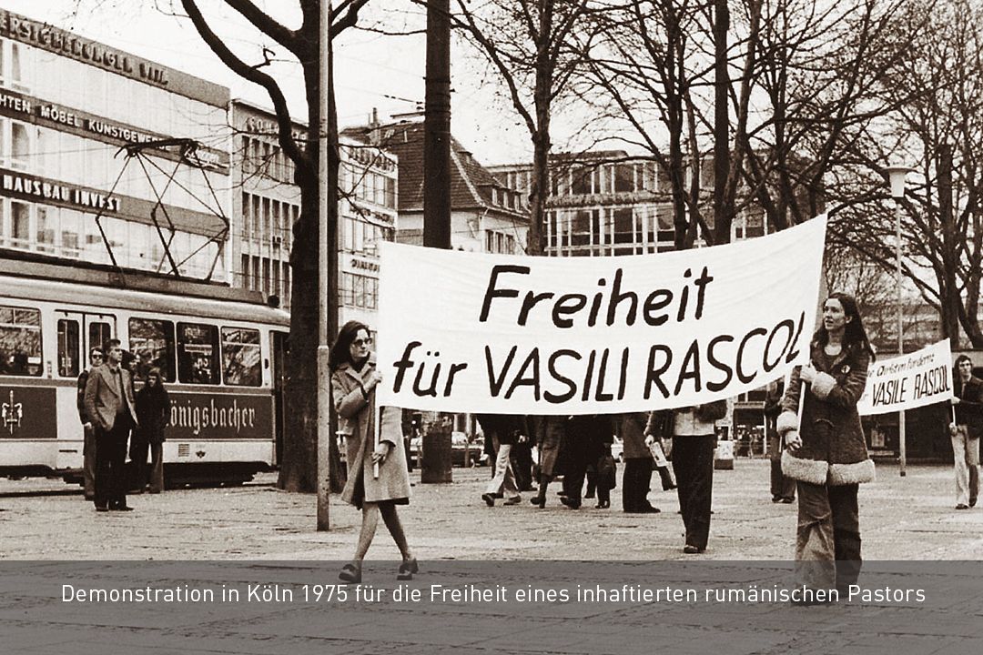 Erste Aktion von AVC ist eine Demonstration in Köln für inhaftierte rumänische Pastoren. Ihr »Verbrechen«: Annahme von Bibeln im Rahmen von Hilfsgüterlieferungen aus Deutschland.